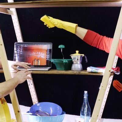The didactic amphitheatre is a theatre event, an occasion to reflect lightly on the role of digital systems in the everyday life of Ina, a housewife. Ina tidies things up all day long… But how much will the digital world help her in her chores? Will she have time to carefully tidy her own life, or will she get lost in an obscure selfie? Will she be smart enough to develop strategies to run her life online together with her partner, Lollo, who works with digital systems? We will ponder together on metaphors such as “Cleaning up is like loving. Nothing we can do about it: the time will come to everyone”, “Every time I do the washing up, I also clean my thoughts: some are rough and greasy, others are thin and light. I always put the latter in the dish rack first.” Metaphors and aphorisms are not just appendixes in language, but they allow us to interpret and act in the world in a different manner. Our metaphors govern us and they are like interfaces with reality using our imagination. But can we tidy up our own thoughts every now and then? We will be waiting for you in front of Ina’s sink. Because at the end of the day, there will always be dishes to wash… Offline.